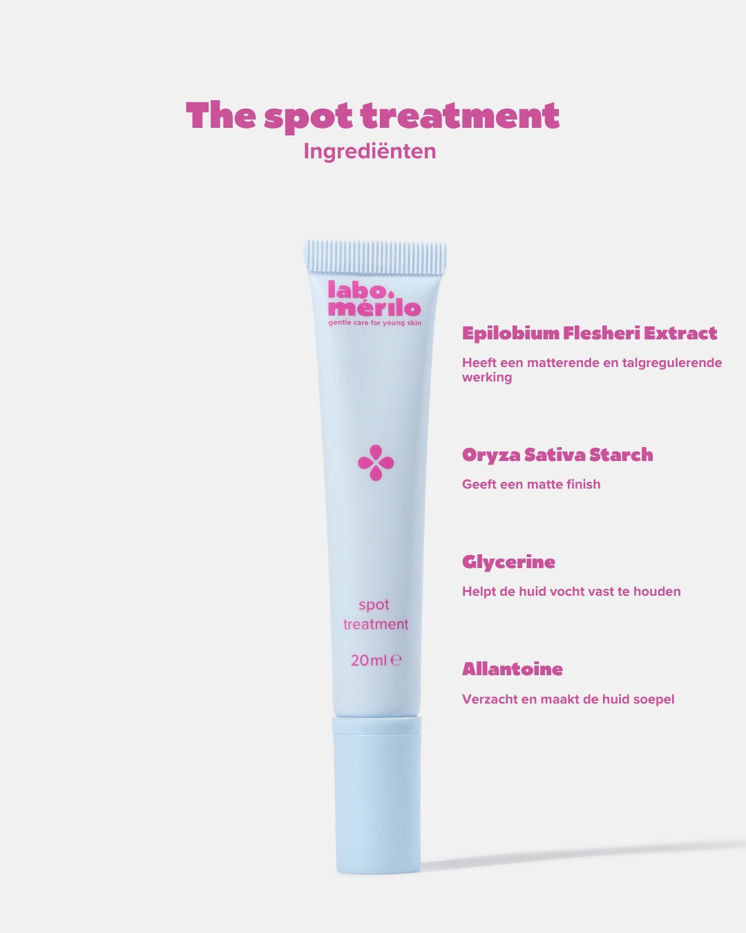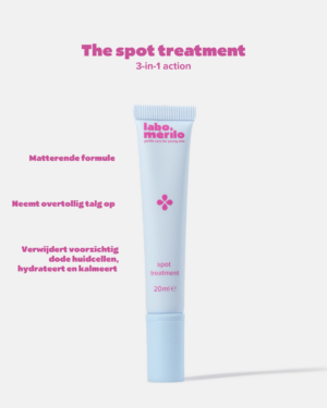 Het spot treatment (20ml) is een matterende formule die helpt overtollig talg te absorberen en exfolieert zacht zonder de huidbarrière te verstoren. Hydraterende en kalmerende ingrediënten bieden ondersteuning voor een heldere huid in balans.