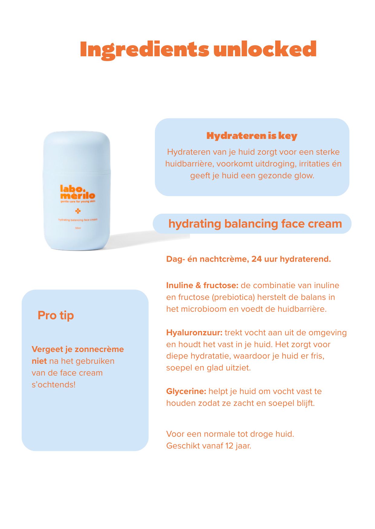 - Hydrating balancing face cream: hydrateert 24 uur lang zonder je poriën te verstoppen terwijl het de huid zacht laat aanvoelen.