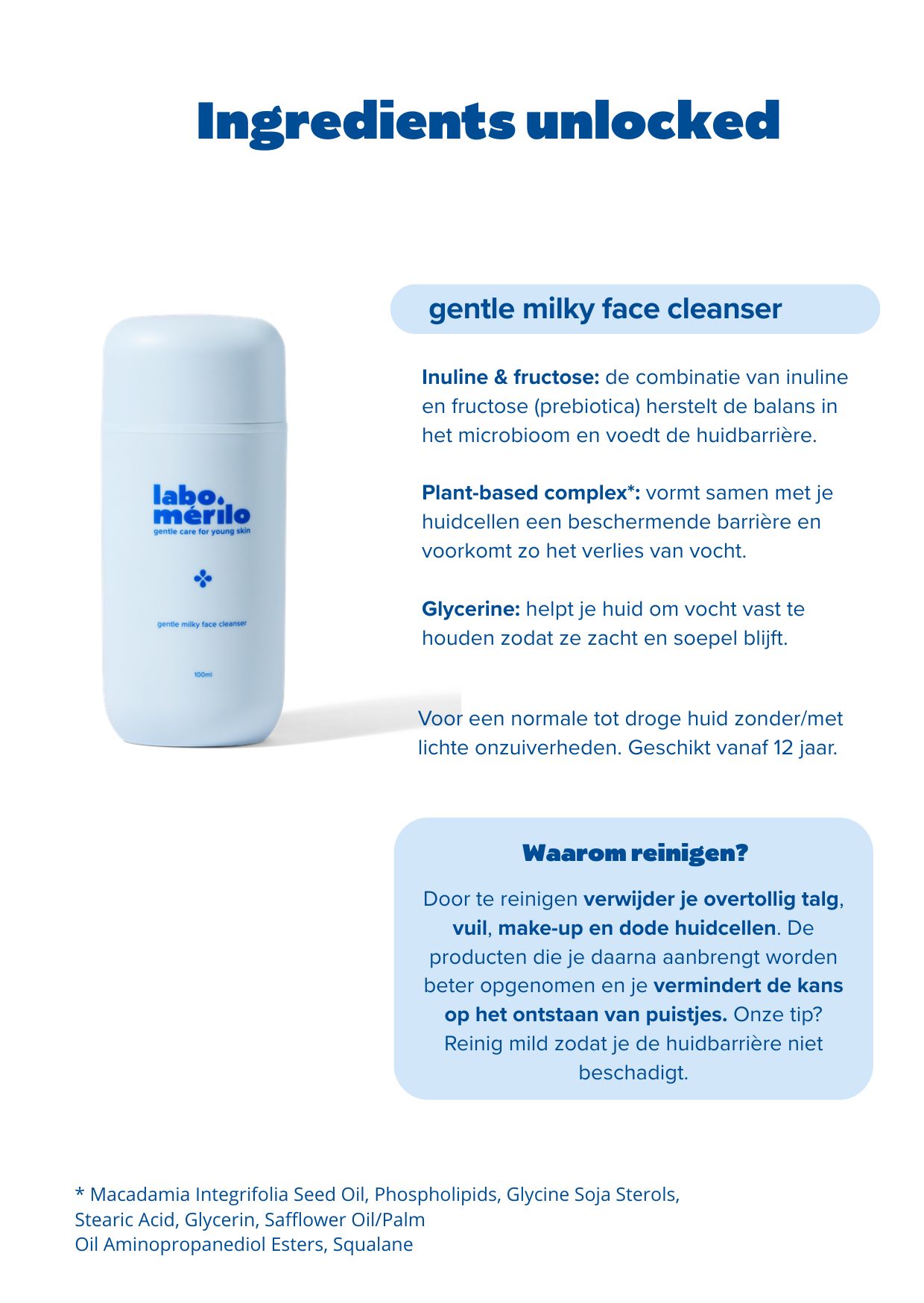 - Gentle milky face cleanser: verwijdert zachtjes vuil en overtollig talg zonder je huid uit te drogen.