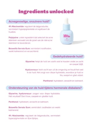 Clarifying serum: Aqua, Isononyl isononanoate, Niacinamide, Glycerin, Dipropylene glycol, Phenoxyethanol, Inulin, Panthenol, Polyacrylate crosspolymer-6, Ethylhexylglycerin, Fructose, Sodium Hyaluronate, Tocopherol, Boswellia Serrata Gum, Citric Acid, Helianthus Annuus Seed Oil, T-butylalcohol, Polylysine.
