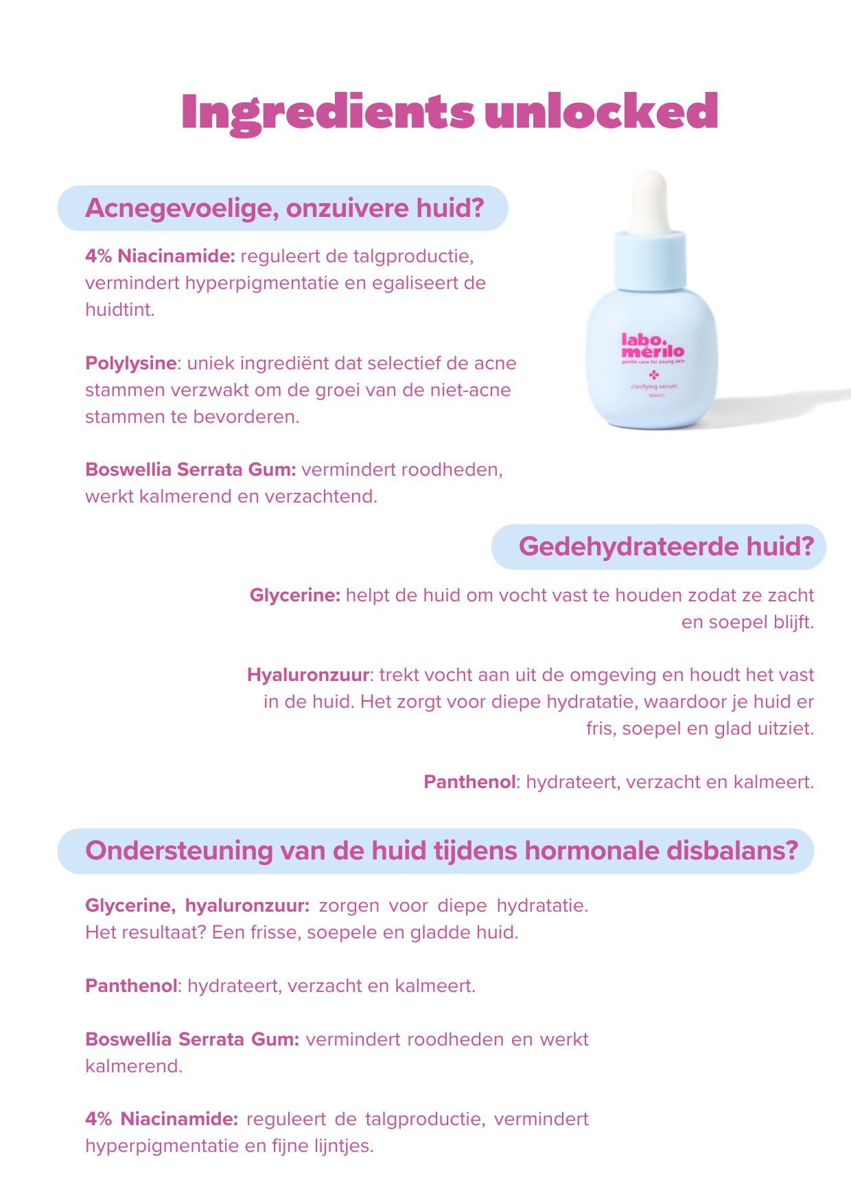 - Clarifying serum: zorgt voor een extra hydratatie terwijl het verzachtend en kalmerend werkt. Door de aanwezigheid van niacinamide zal het talgregulerend werken terwijl polylysine balans brengt in het microbioom. Ideaal voor de acnegevoelige, onzuivere of gedehydrateerde huid.